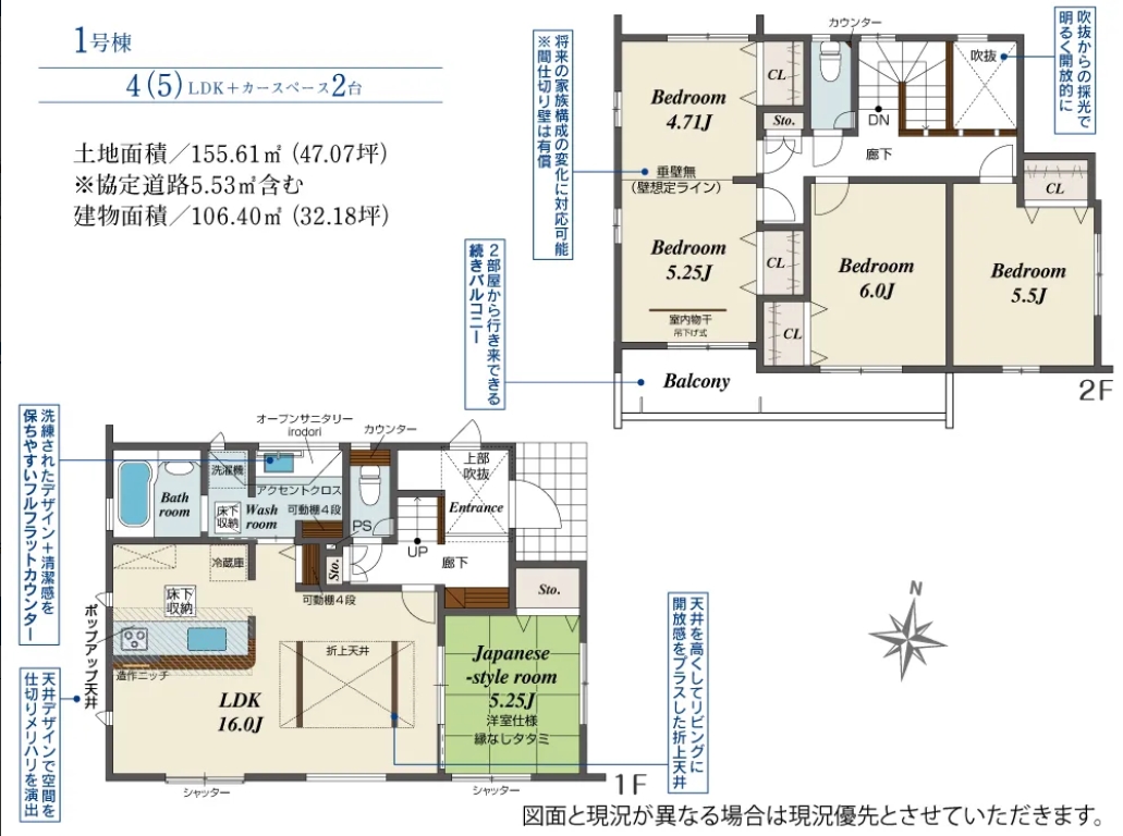 | 間取内容 | LDK16帖 1階 1室和室5.25帖 1階 1室洋室9.96帖 2階 1室洋室6.0帖 2階 1室洋室5.5帖 2階 1室 ※5LDKにも対応 |