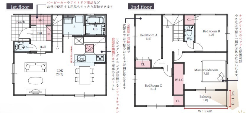 間取内容 | LDK20帖 1階 1室洋室7.5帖 2階 1室洋室6.1帖 2階 1室洋室5.6帖 2階 1室洋室5.2帖 2階 1室 4LDK+WIC+SIC |