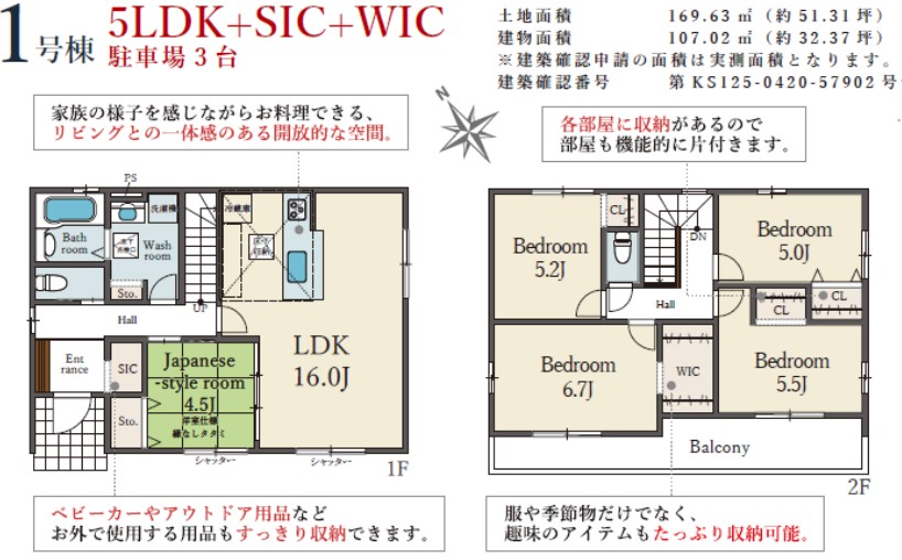 | 間取内容 | LDK16帖 1階 1室和室4.5帖 1階 1室洋室6.7帖 2階 1室洋室5.5帖 2階 1室洋室5.2帖 2階 1室洋室5.0帖 2階 1室 5LDK+SIC+WIC |