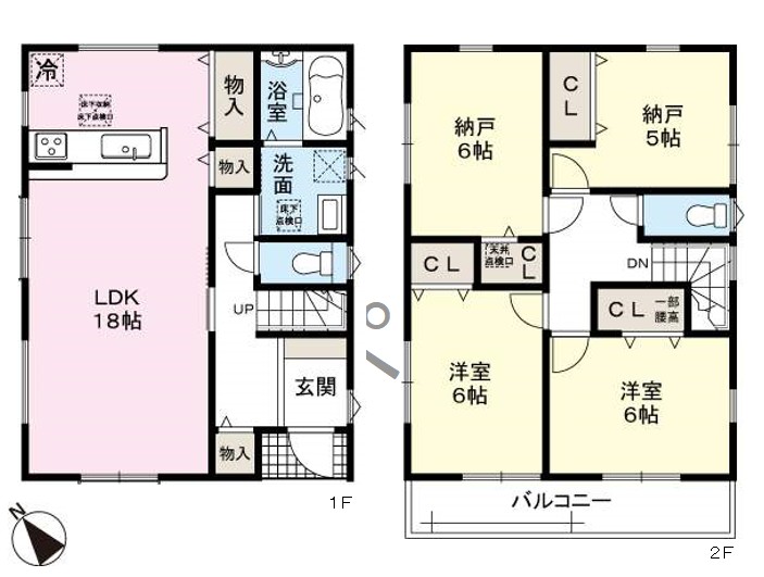 | 間取内容 | LDK18帖 1階 1室洋室6帖 2階 2室S6帖 2階 1室S5帖 2階 1室 2LDK+2S |