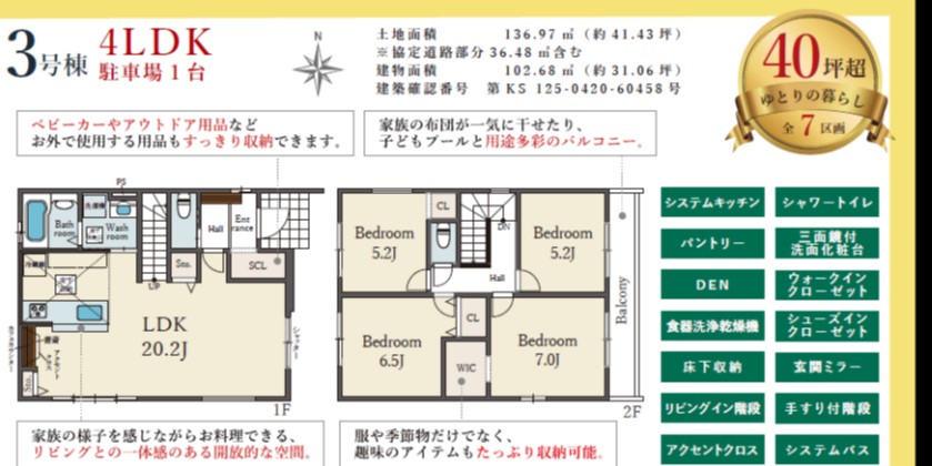 | 間取内容 | LDK20.2帖 1階 1室洋室7.0帖 2階 1室洋室6.5帖 2階 1室洋室5.2帖 2階 2室 | ||